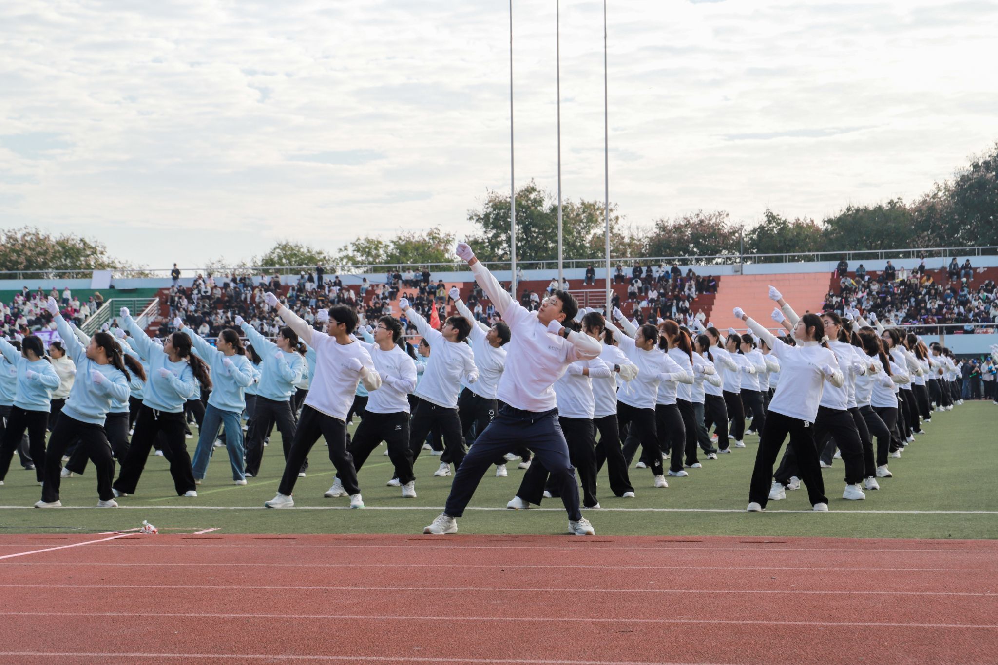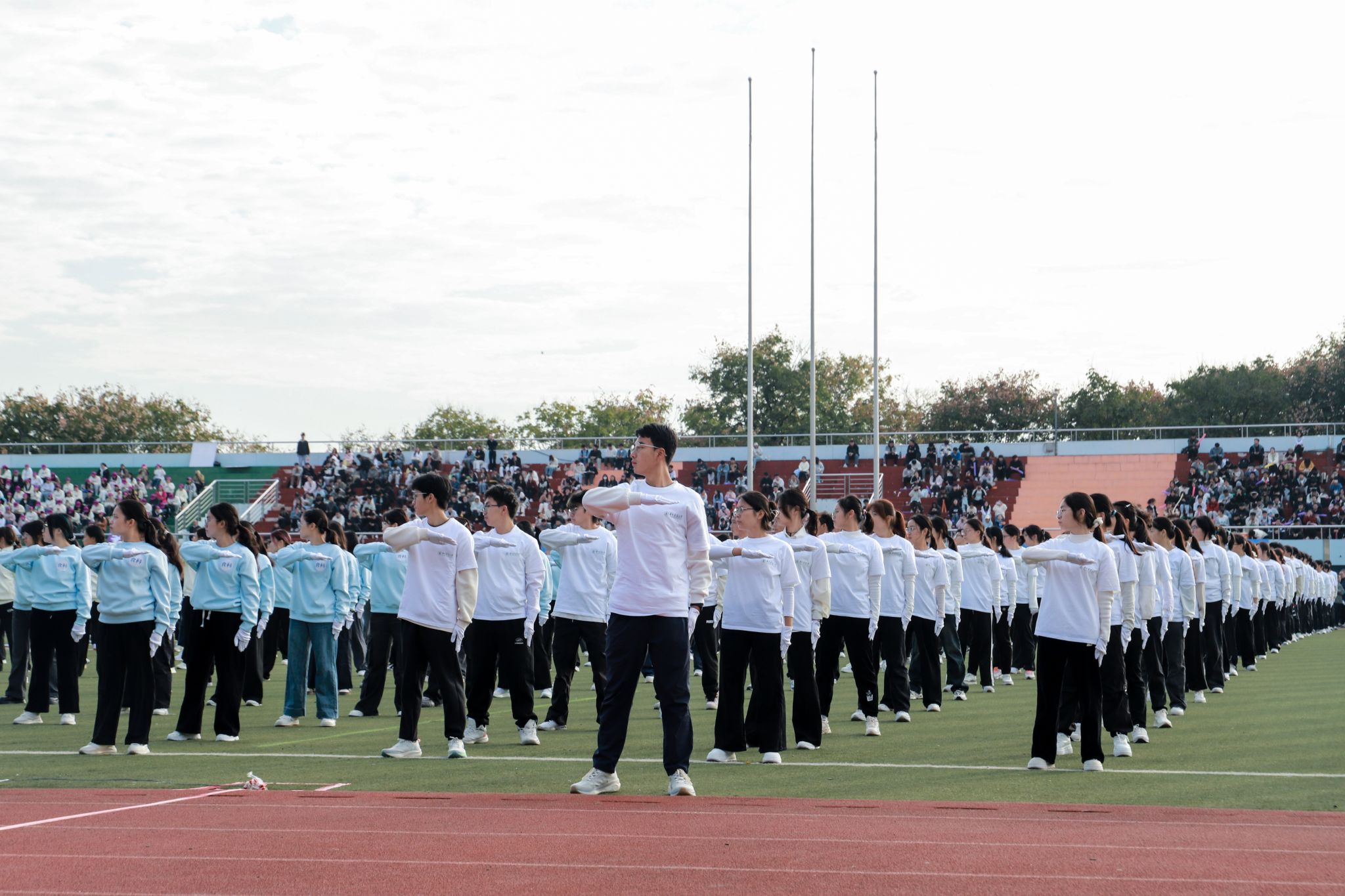 10月24日上午,我院2025级部分新生参与了广播操汇演比赛,在秋日的赛场上展现出蓬勃朝气与团结一致的精神风貌。同学们身着统一整洁的白色院服与黑色长裤,动作整齐、精神抖擞,成为运动场上一道亮丽的风景线。