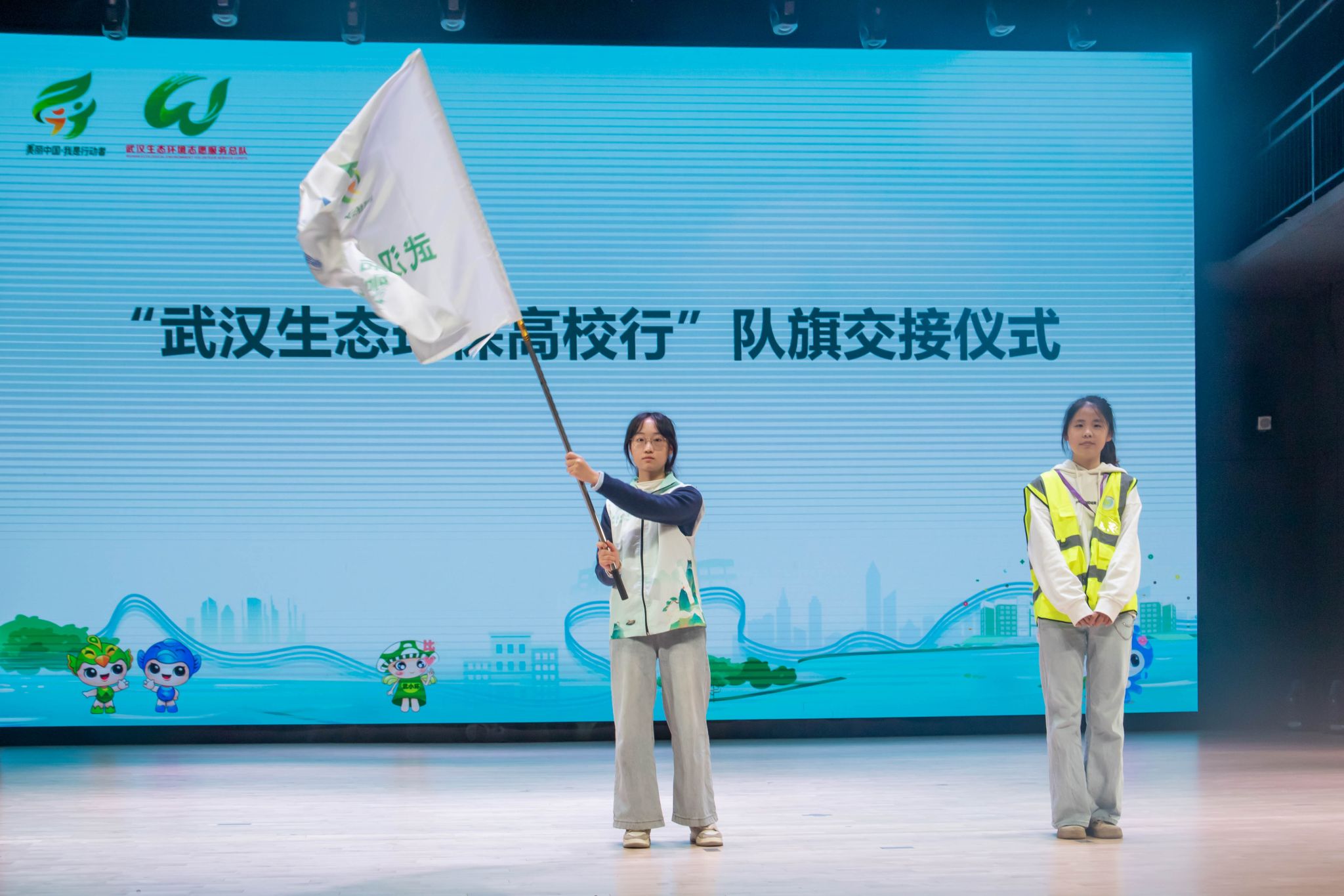 璀璨灯下,舞台之间,华中农大志愿者表演诗朗诵《美丽的江城河湖》,抒发对武汉河湖的深情礼赞。活动中,“武汉生态环保高校行”队旗交接到我校绿色协会执行会长王修函同学手中,象征着环保使命在高校间的持续传递。