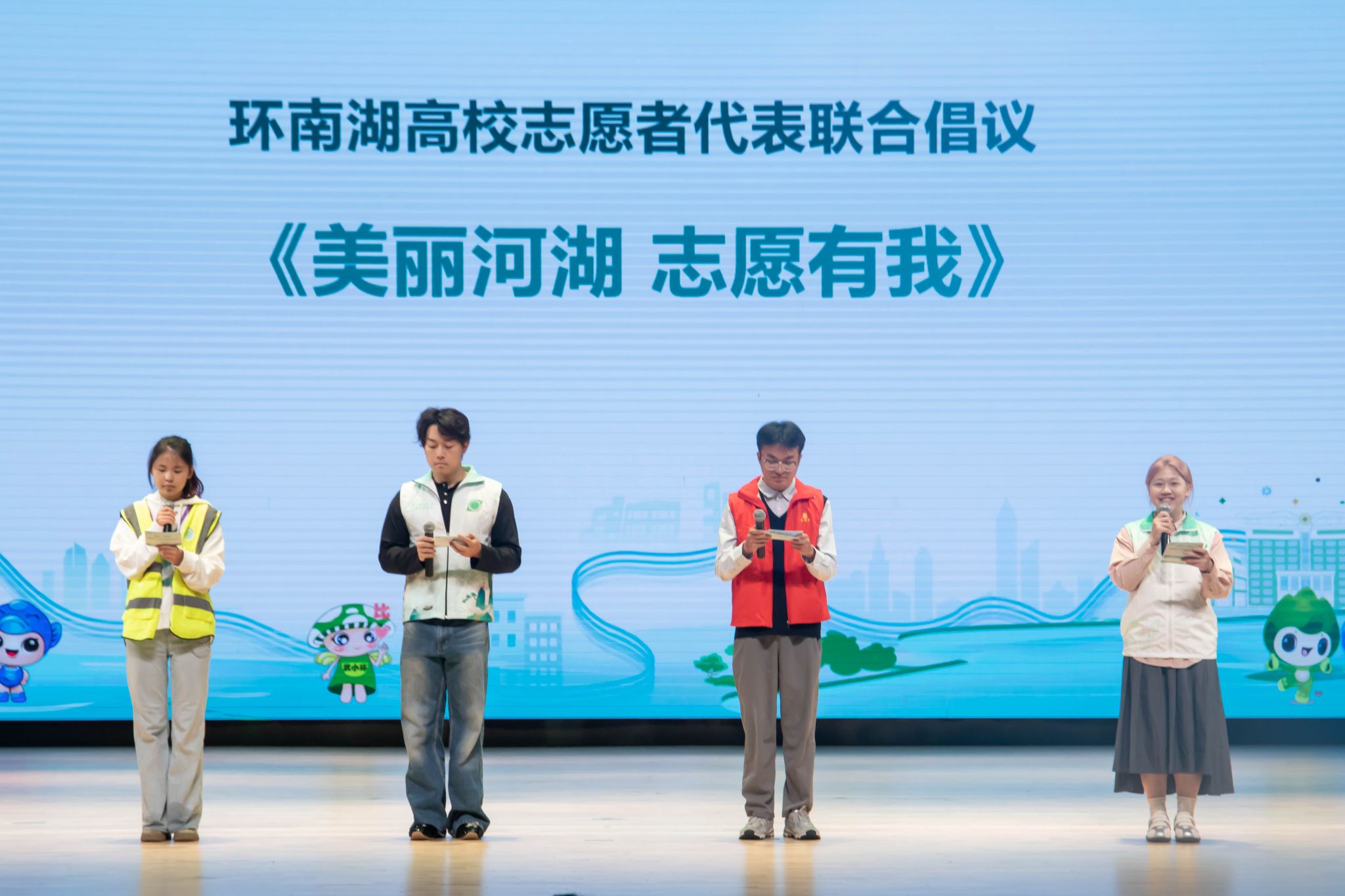 在活动倡议环节,来自华中农业大学、中南财经政法大学、武汉理工大学、华中师范大学的4位志愿者代表共同发出“践行节水护湖行动 共建共享美丽河湖”行动倡议。