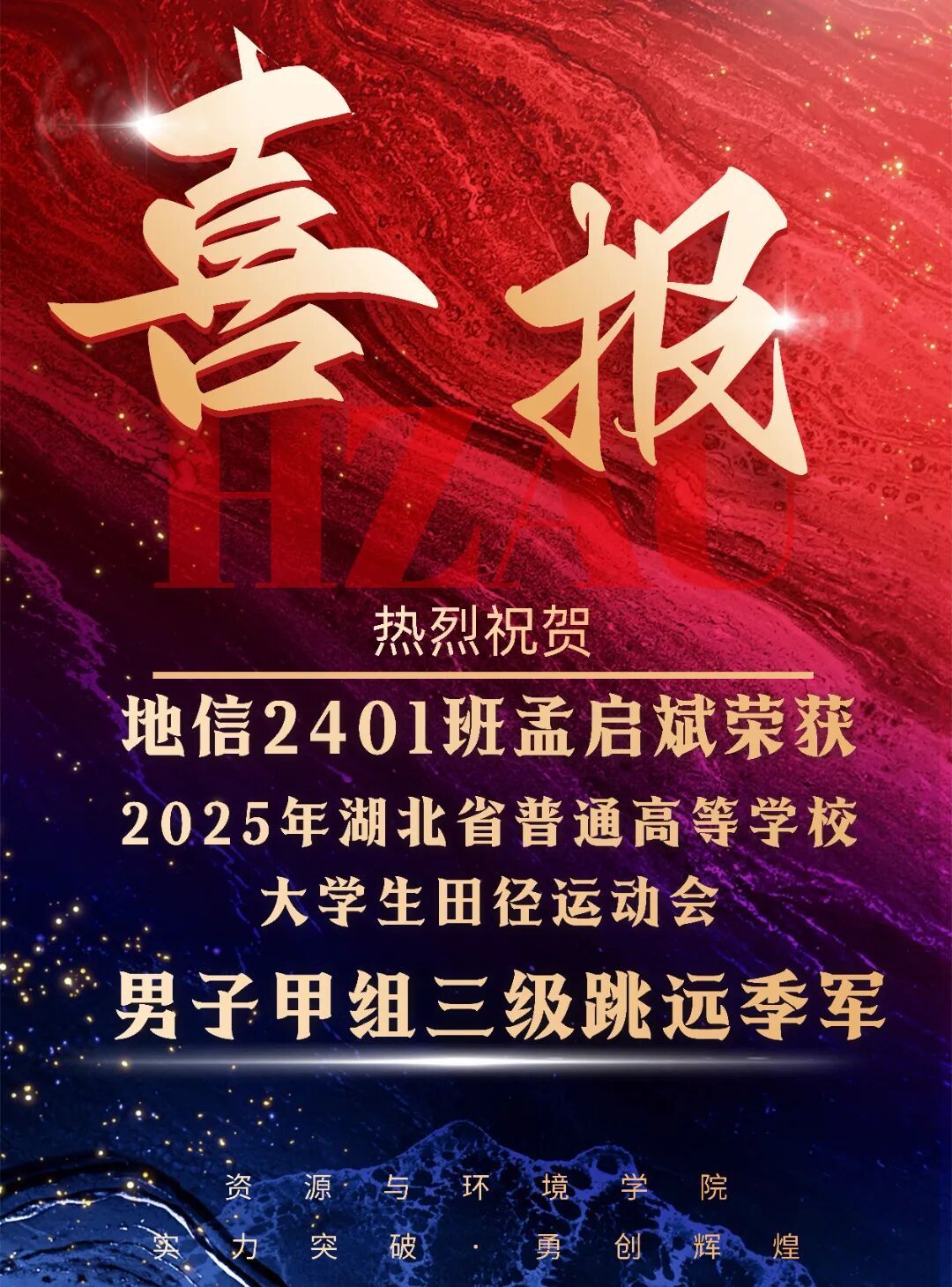 下一篇:捷报!我院2023级研究生雷安斩获2025年湖北省大学生田径赛男子甲组110米栏季军!