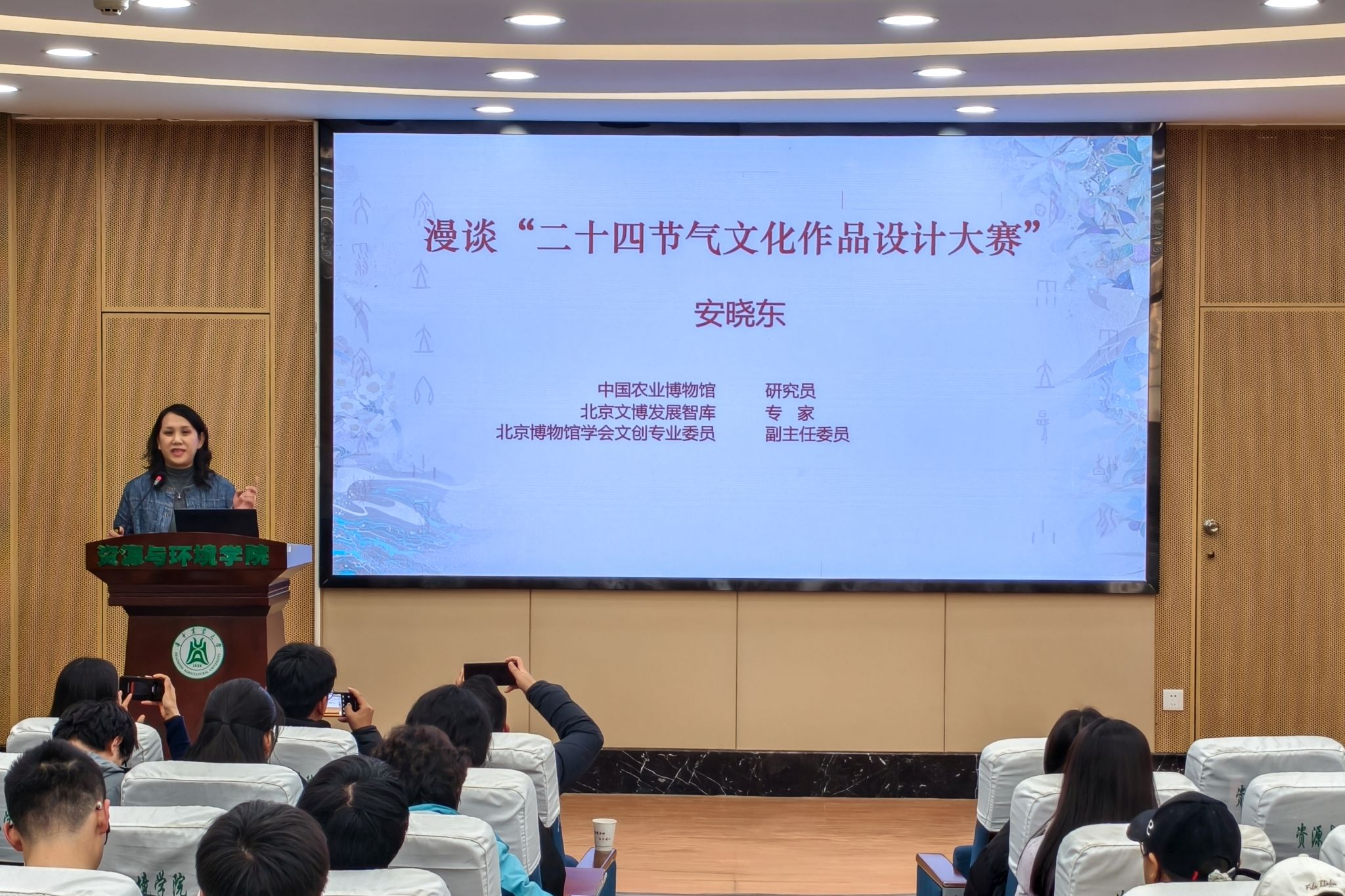 (通讯员:侯博一 陈昕怡)11月22日下午,资源与环境学院在西附楼报告厅举办以“二十四节气文化作品设计与中国农业文明”为主题的专题讲座。中国农业博物馆研究员、原全国农业展览馆文创中心主任安晓东担任主讲人,植物科学技术学院教授柏芸、马克思主义学院副教授唐尚书以及资源与环境学院副院长丁洁等嘉宾出席,学院百余名学生到现场学习。