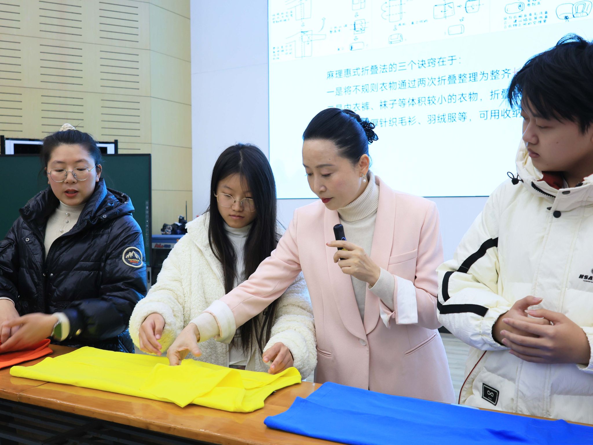 除了理论知识,实践技巧更是本次讲座的一大亮点。陈庆利详细拆解了空间整理的“八大流程”与“分类筛选原则”,并现场邀请四位同学参与互动演练。通过“ABC 叠衣法”等实用方法的演示,原本需要花费较长时间整理的物品,在短短几秒内便被规整得井井有条,让在场听众直观感受到科学整理方法的高效性。环境工程2302班张槟蛘同学直呼太神奇了,他感慨到:“以前总被宿舍杂乱的问题困扰,找东西要花很久,还影响和室友的相处。现在我知道怎么用简单的步骤让小宿舍变整洁,不仅能提高生活效率,还能让宿舍氛围更融洽,真的特别有价值。”