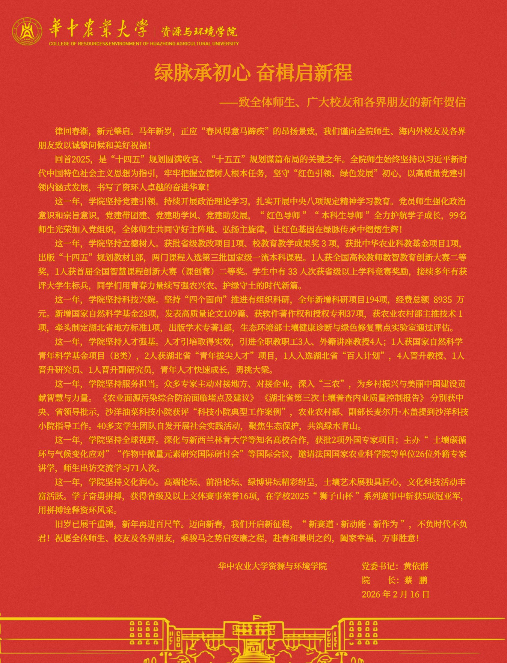 绿脉承初心 奋楫启新程—致全体师生、广大校友和各界朋友的新年贺信