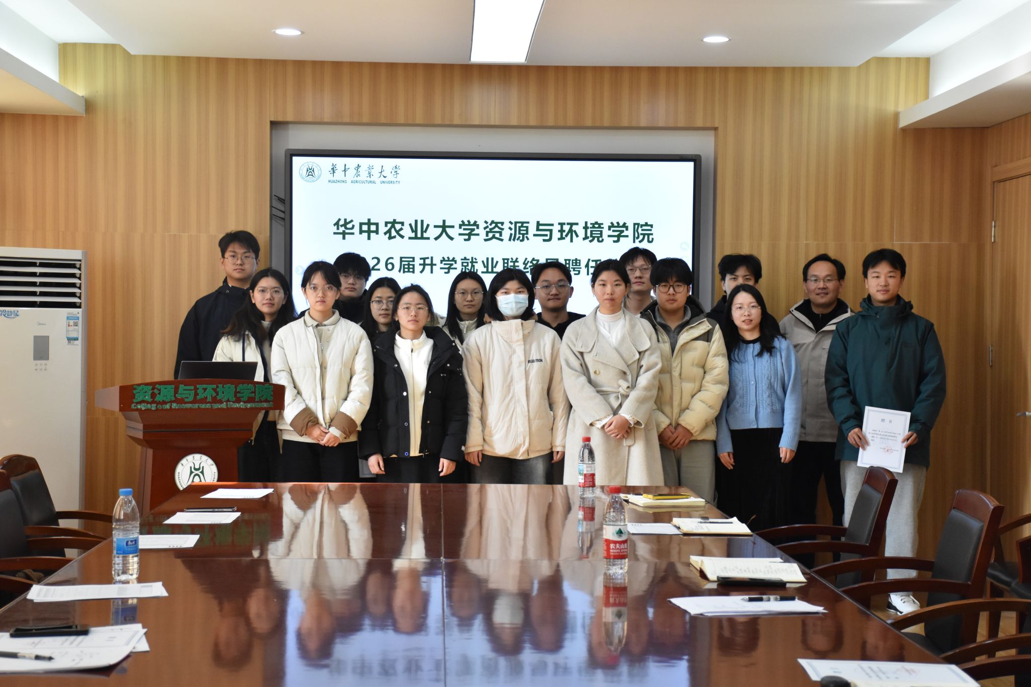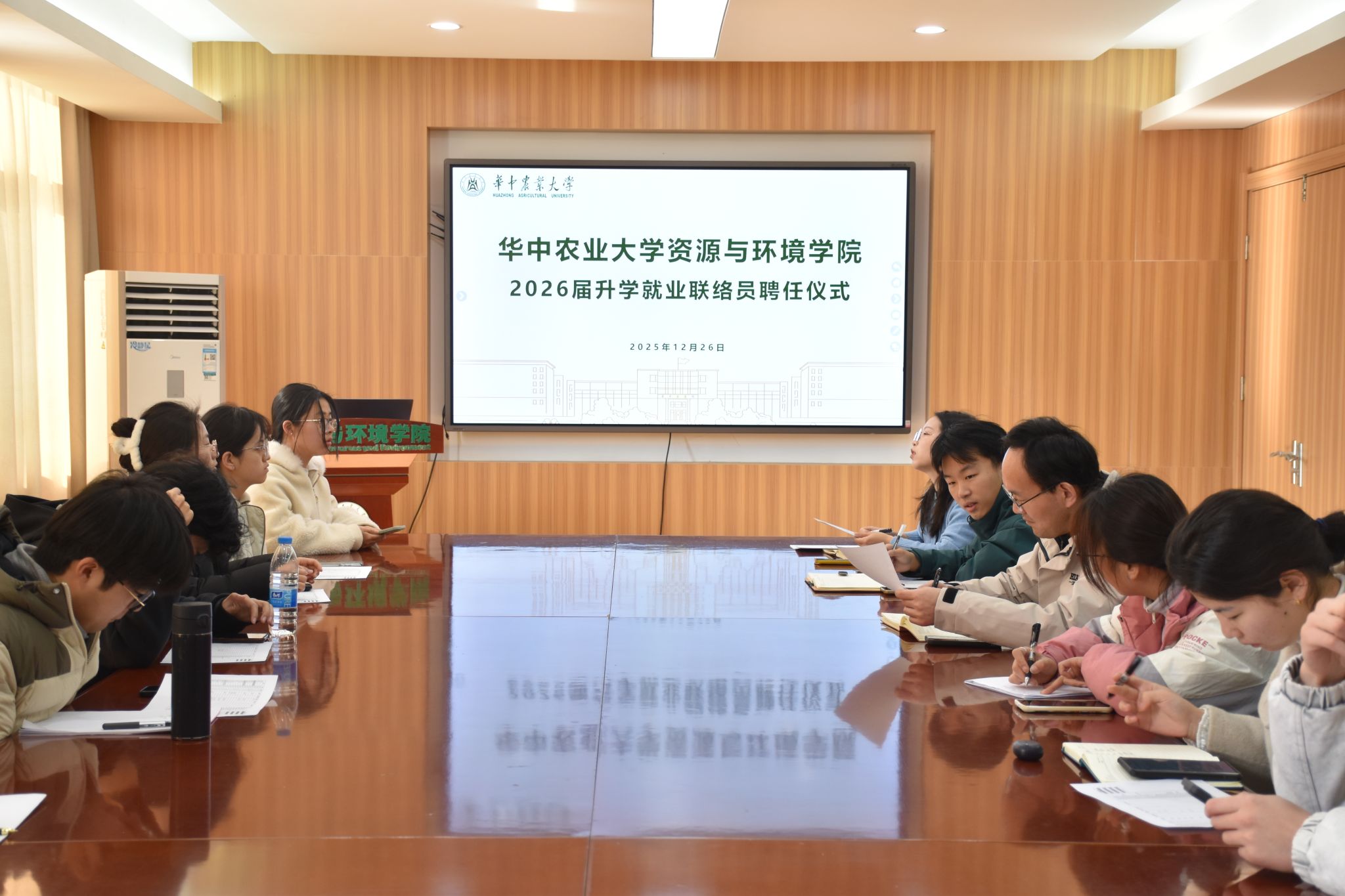 2025年12月26日,华中农业大学资源与环境学院举行2026届升学就业联络员聘任仪式暨就业工作座谈会,学院党委副书记熊海林出席会议并做就业形势分析与指导,本科生辅导员汤春燕参会。